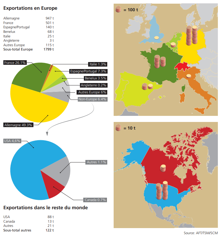 En 2024, 1'934 tonnes de Tête de Moine AOP sont arrivées sur les tables des consommateurs dans les pays étrangers. Près de 50% de ce volume est vendu en Allemagne et en France. La vente hors de l'Union Européenne joue un rôle secondaire, mais progressif.